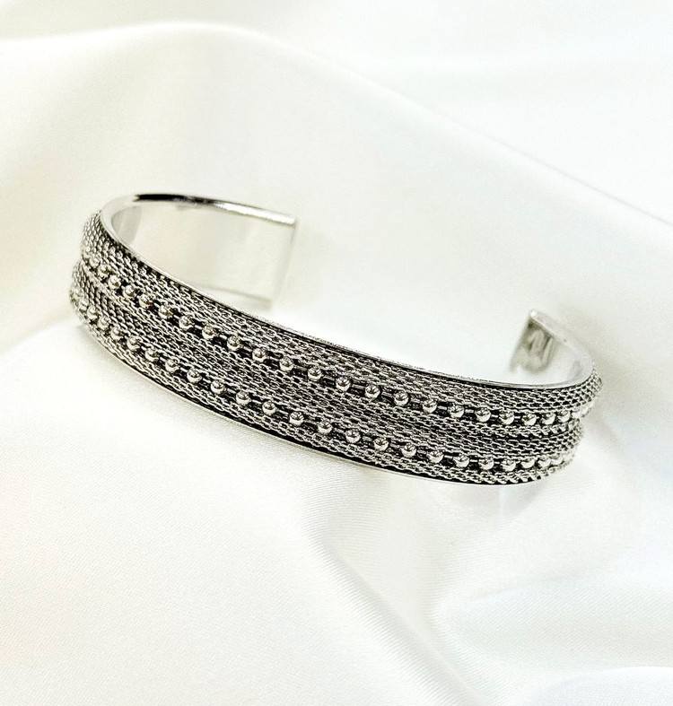 - طراحی شیک و مدرن – بافت ظریف و درخشان این دستبند، آن را به گزینهای لوکس و جذاب برای استفاده روزمره و مجالس تبدیل میکند.