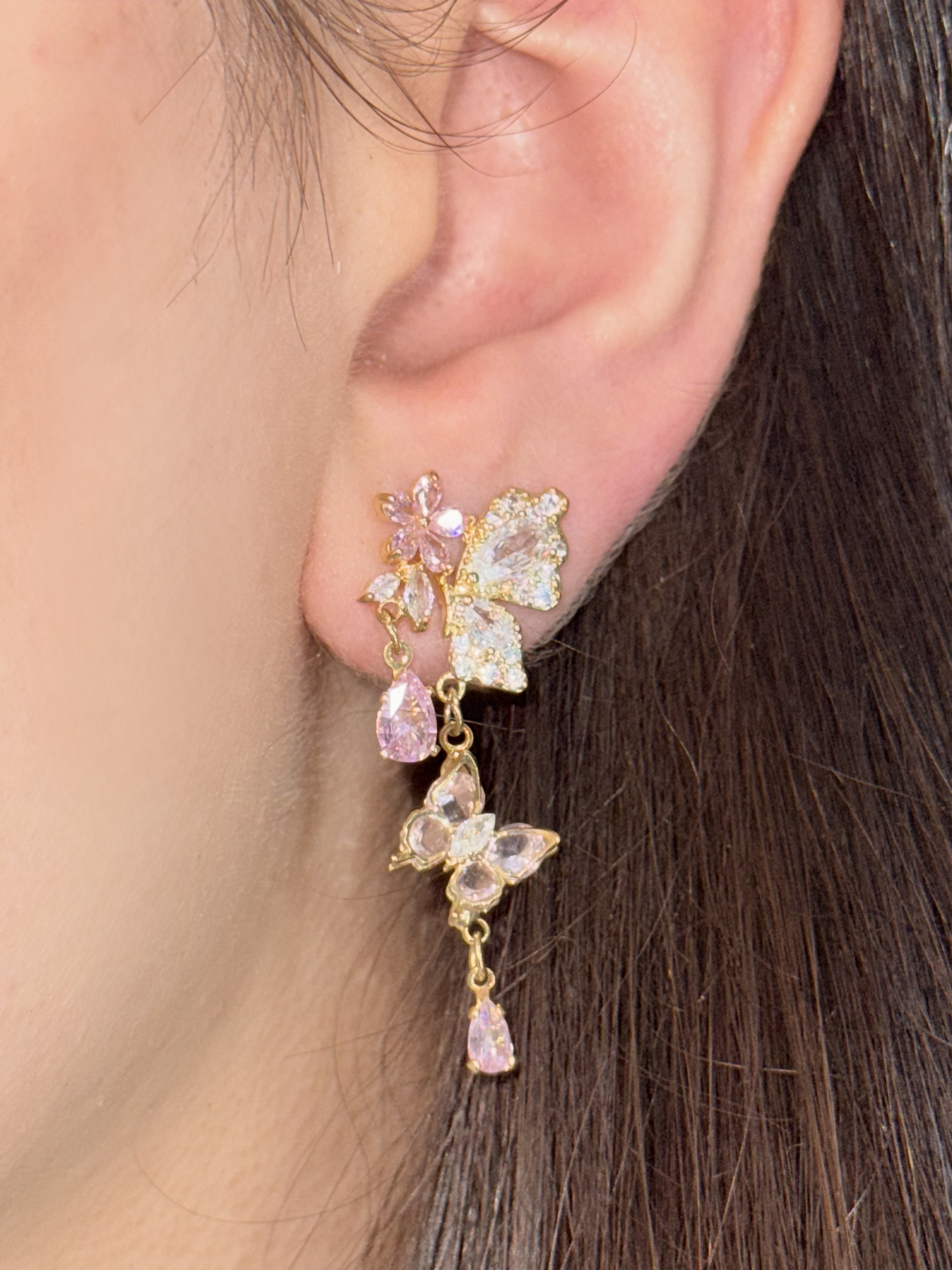 این گوشوارههای پروانهای زیبا با طراحی خاص و نگینهای ظریف، انتخابی فوقالعاده برای کسانی است که به جواهرات ظریف و درخشان علاقه دارند.