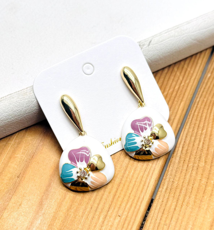 گوشواره زنانه آویز نقاشی شده گل بنفش مینیمال رنگ گلد