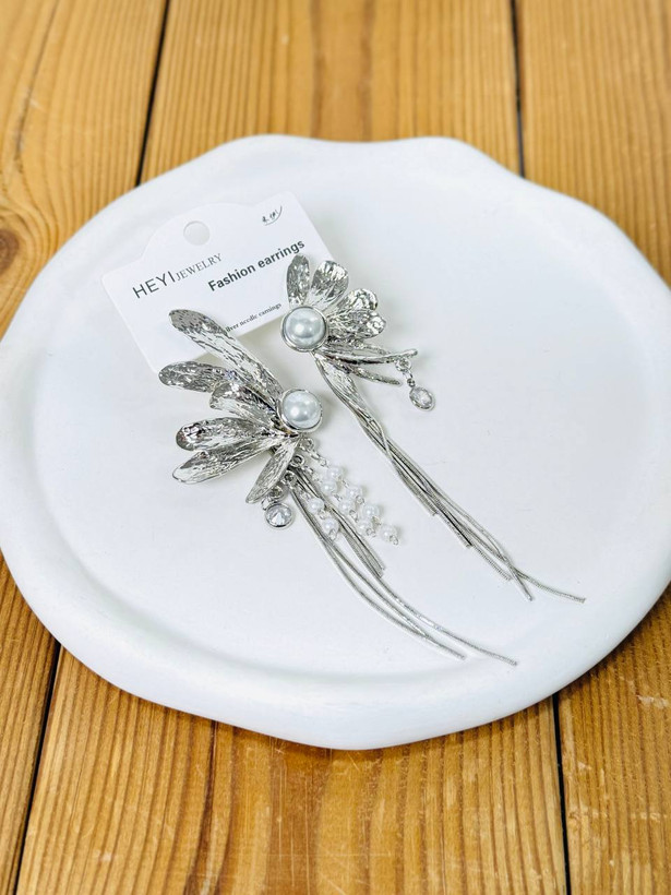 گوشواره زنانه فانتزی مروارید آویز سیلور رنگ نقره ای