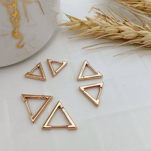گوشواره مثلثی سه سایزی، آبکاری طلا رنگ ثابت و ضد حساسیت، این مدل سه سایز داره، این سایز متوسط هست، میتونی 3 سایز و باهم ست کنی