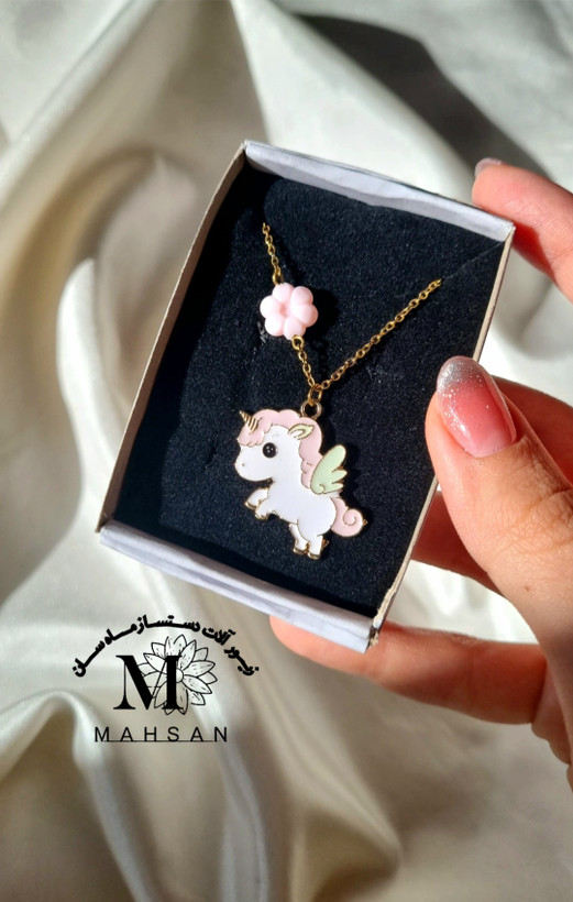 گردنبند یونیکورن تکشاخ فانتزی یاسی با گل یاسی همراه با جعبه