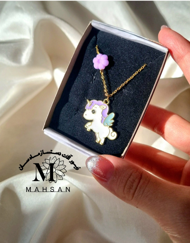 گردنبند یونیکورن تکشاخ فانتزی بنفش با گل بنفش