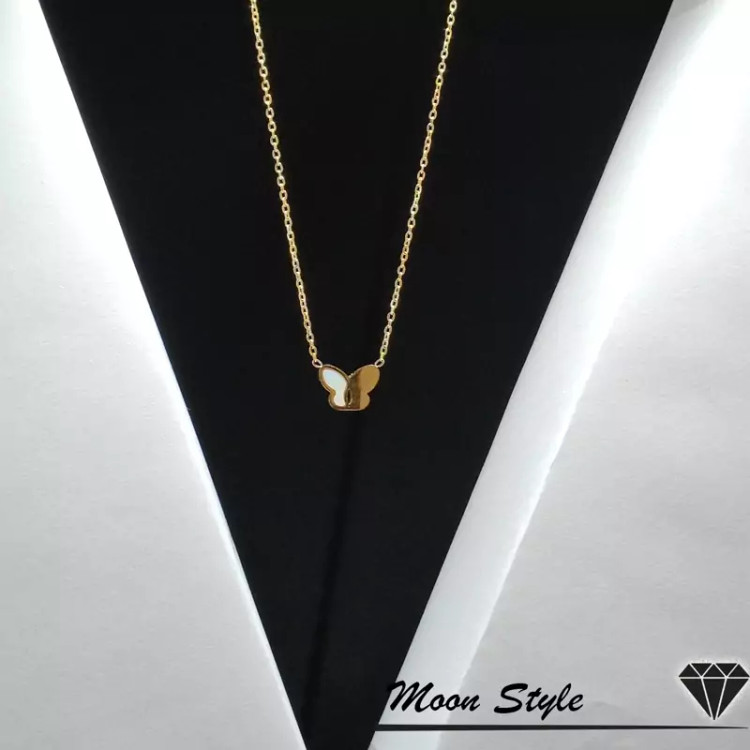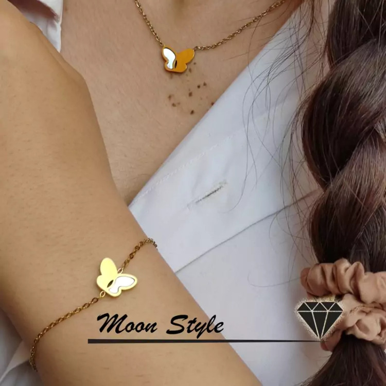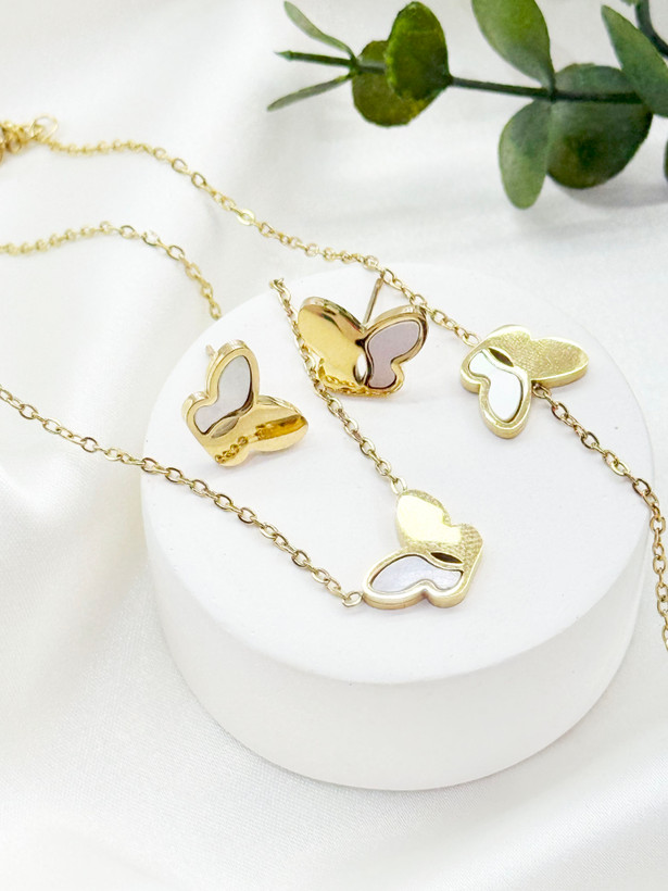 سرویس کامل استیل رنگ ثابت و ضد آب و ضد حساسیت، گردنبند و دستبند و گوشواره، طرح پروانه، نگین سنگی سفید، شیک و خاص