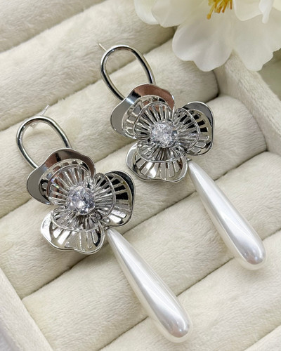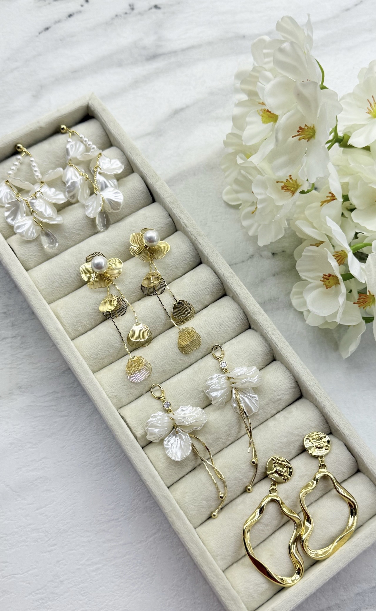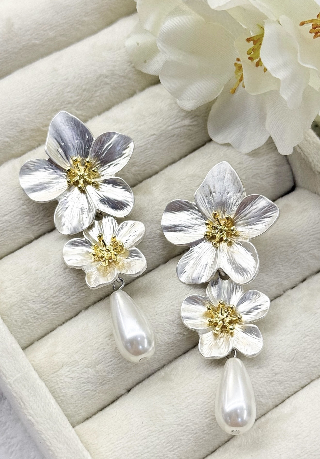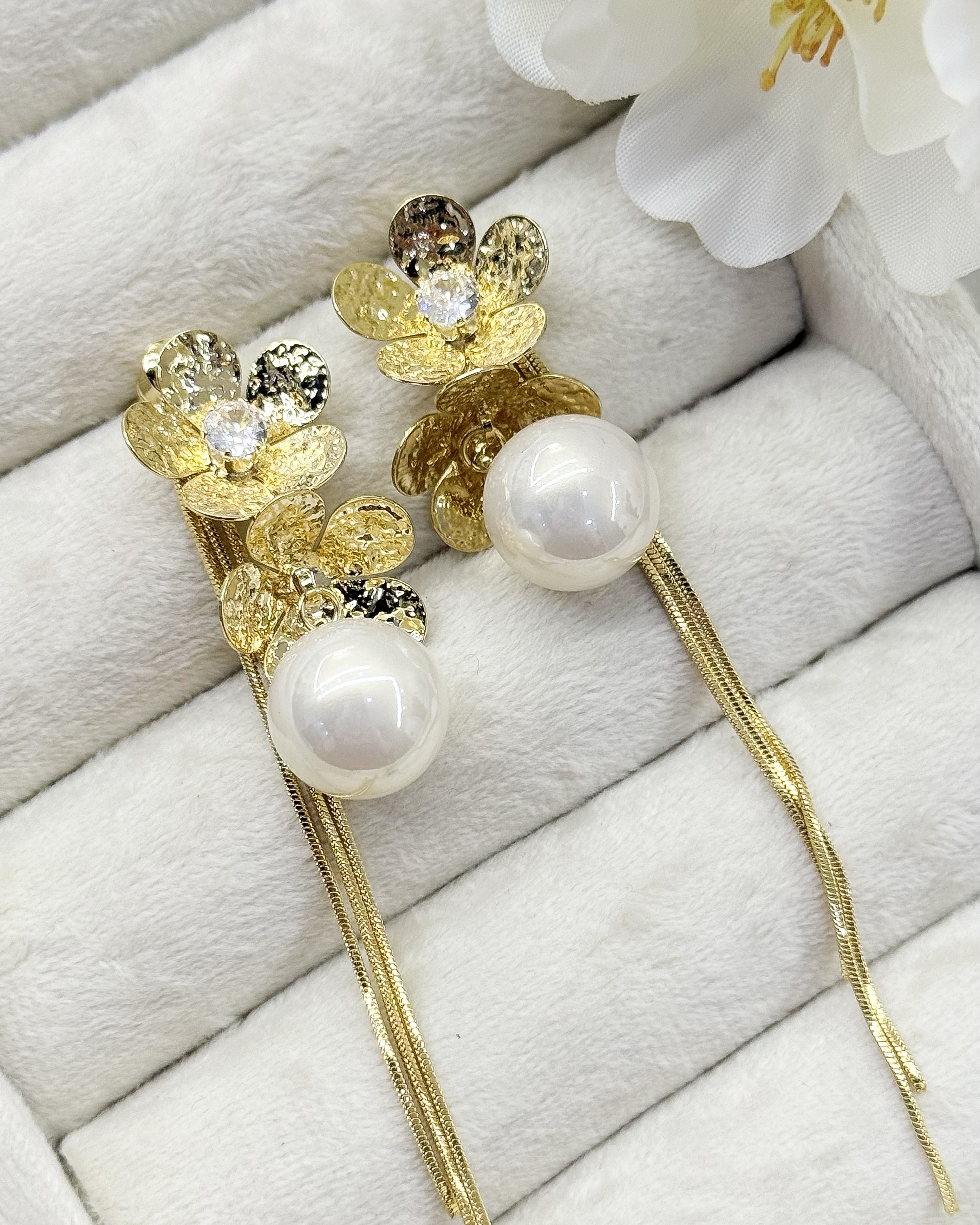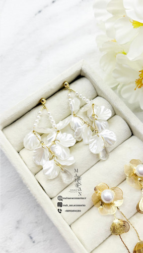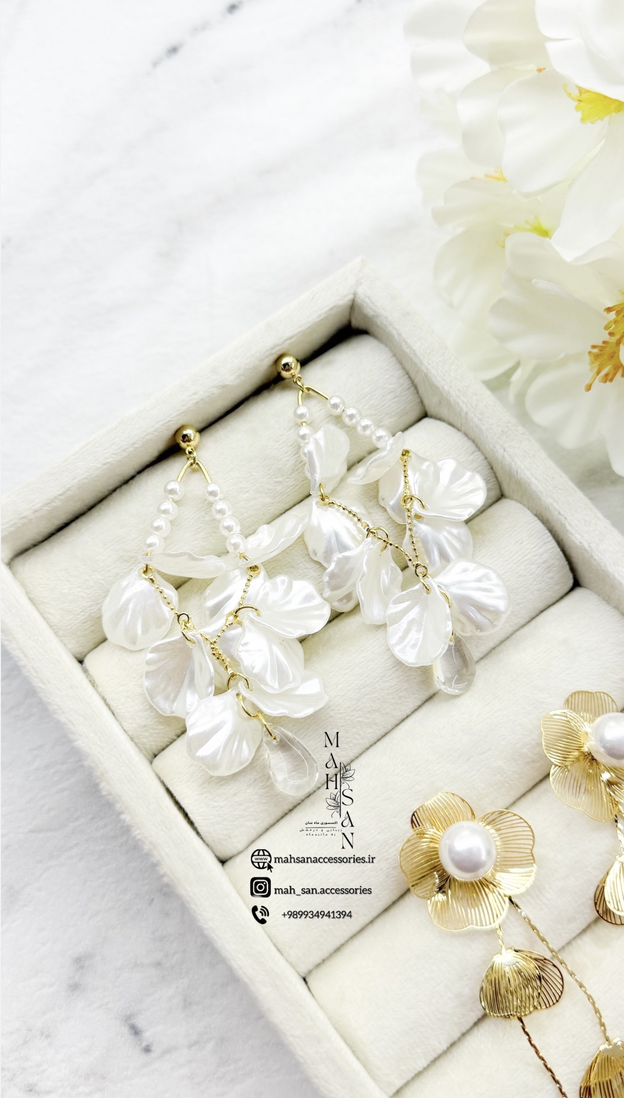 گوشواره گل مرواریدی آویزطلایی تک گل مروارید عکس دوم (دوتا بهم چسبیده نیست)